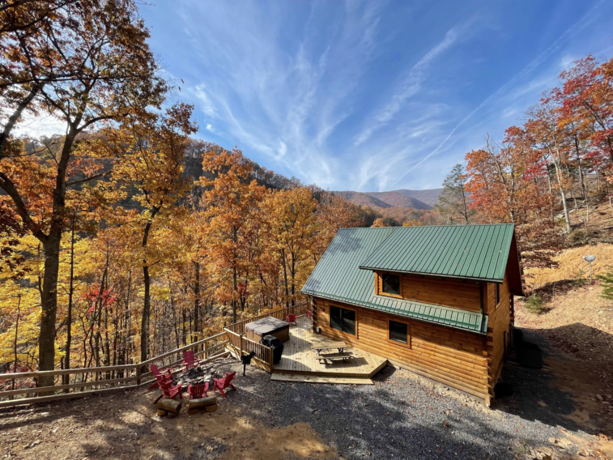 Experience the beauty of fall foliage while relaxing in a hot tub along the banks of West Virginia's North Fork River.